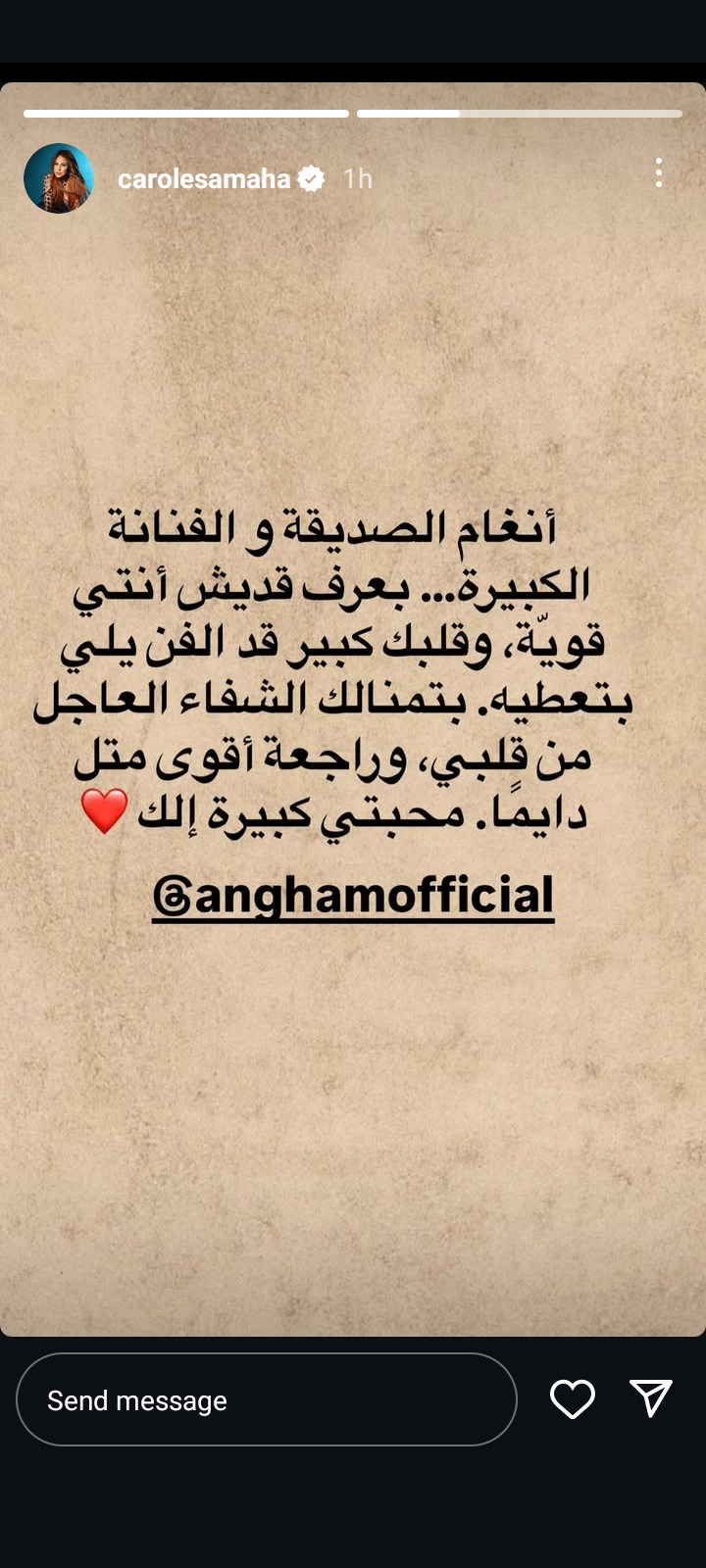 وكتبت كارول سماحة في منشور رصده موقع تحيا مصر على خاصية ستوري بموقع تبادل الصور والفيديوهات انستجرام، مطالبة الدعاء لـ انغام: "انغام الصديقة والفنانة الكبيرة، بعرف قديش انتي قوية وقلبك كبير قد الفن اللي بتعطيه.. بتمنالك الشفاء العاجل ومن قلبي وراجعة أقوى متل دايم.. محبتي كبيرة إلك.