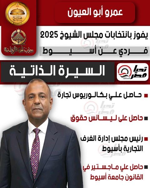 تحيا مصر ينشر السيرة الذاتية للنائب عمرو أبو العيون عضو مجلس الشيوخ 2025 بالنظام الفردي عن أسيوط