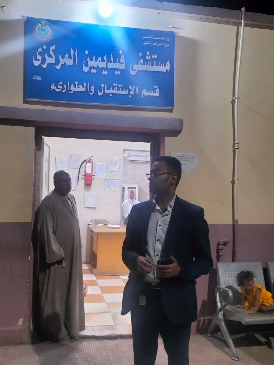 في جولة مسائية مفاجئة قام الدكتور ايمن عباس وكيل وزارة الصحة بالفيوم بالمرور على مستشفى فيديمين المركزي (ب) في حضور الدكتور مبروك علي الزغبي مدير المستشفى.