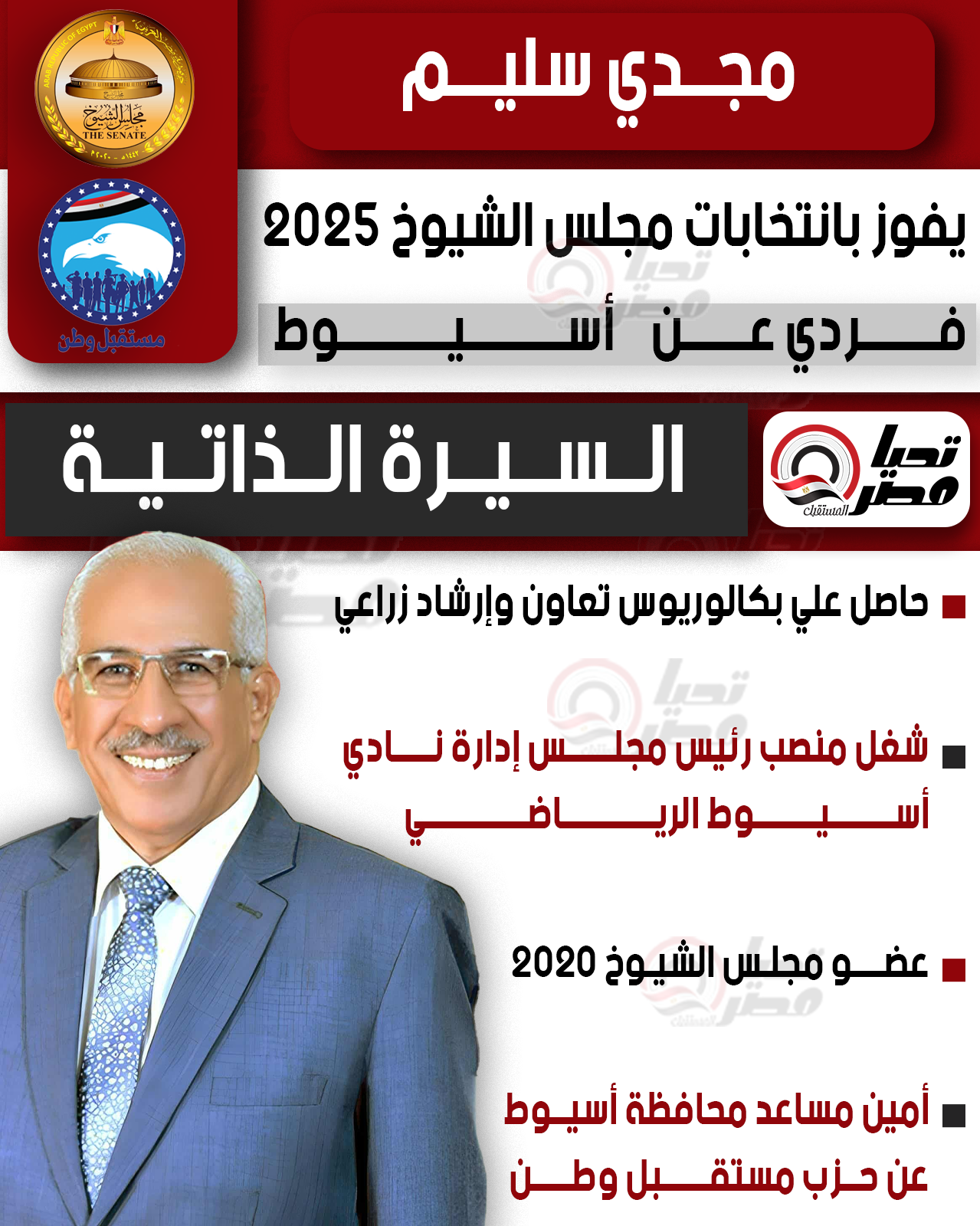تحيا مصر ينشر السيرة الذاتية للنائب مجدي سليم عضو مجلس الشيوخ 2025 بالنظام الفردي عن أسيوط
