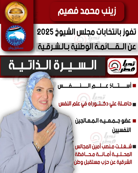 تحيا مصر ينشر السيرة الذاتية للنائبة زينب فهمي عضو مجلس الشيوخ 2025 عن القائمة الوطنية بالشرقية