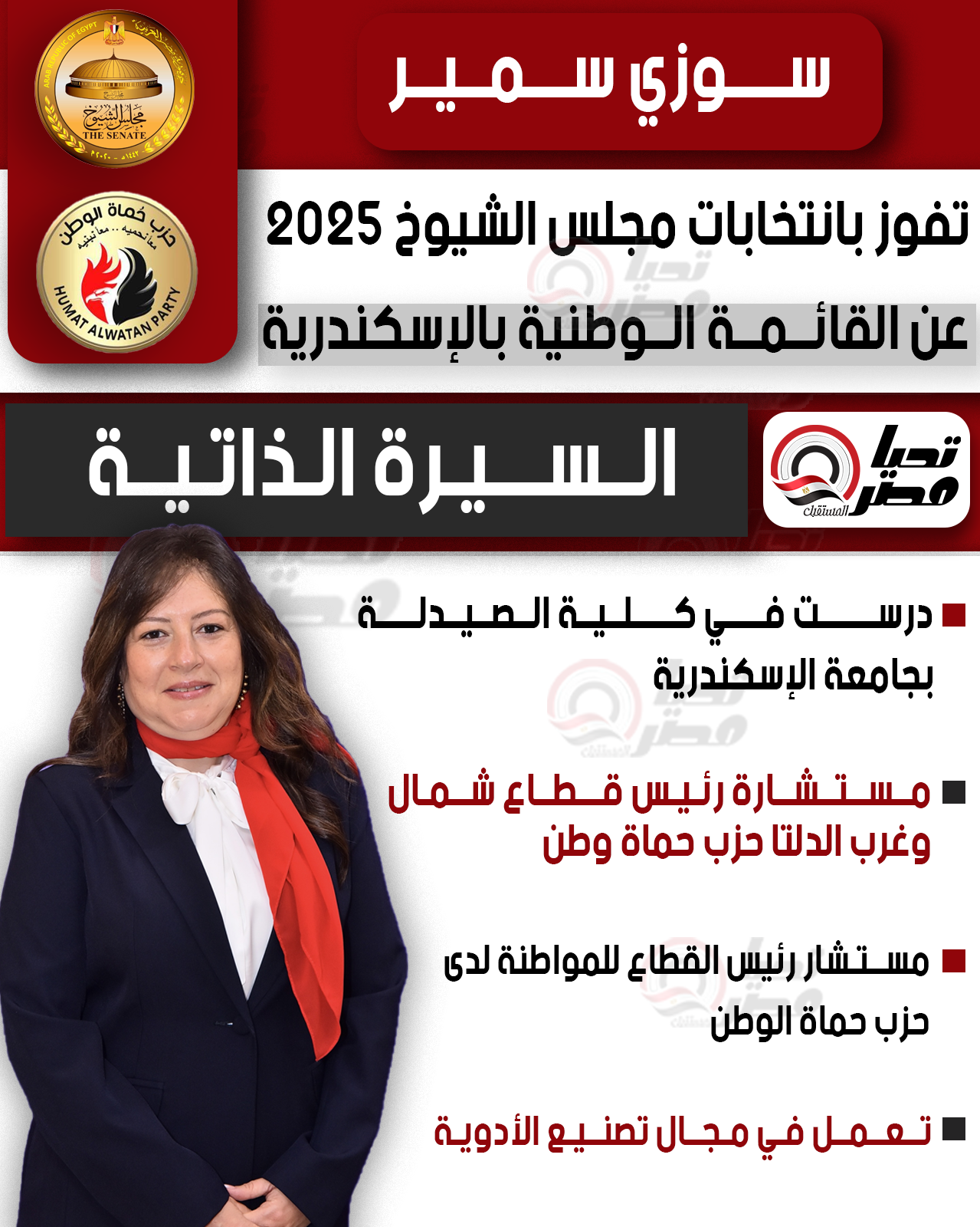 تحيا مصر ينشر السيرة الذاتية للنائبة سوزي سمير عضو مجلس الشيوخ 2025 عن القائمة الوطنية بالإسكندرية