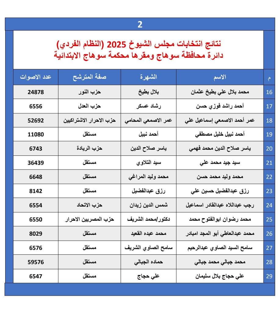 مرشحو مستقبل وطن وحماة الوطن يحصلون على 50%+1 بمقاعد سوهاج الخمسة الفردية بانتخابات الشيوخ 2025
