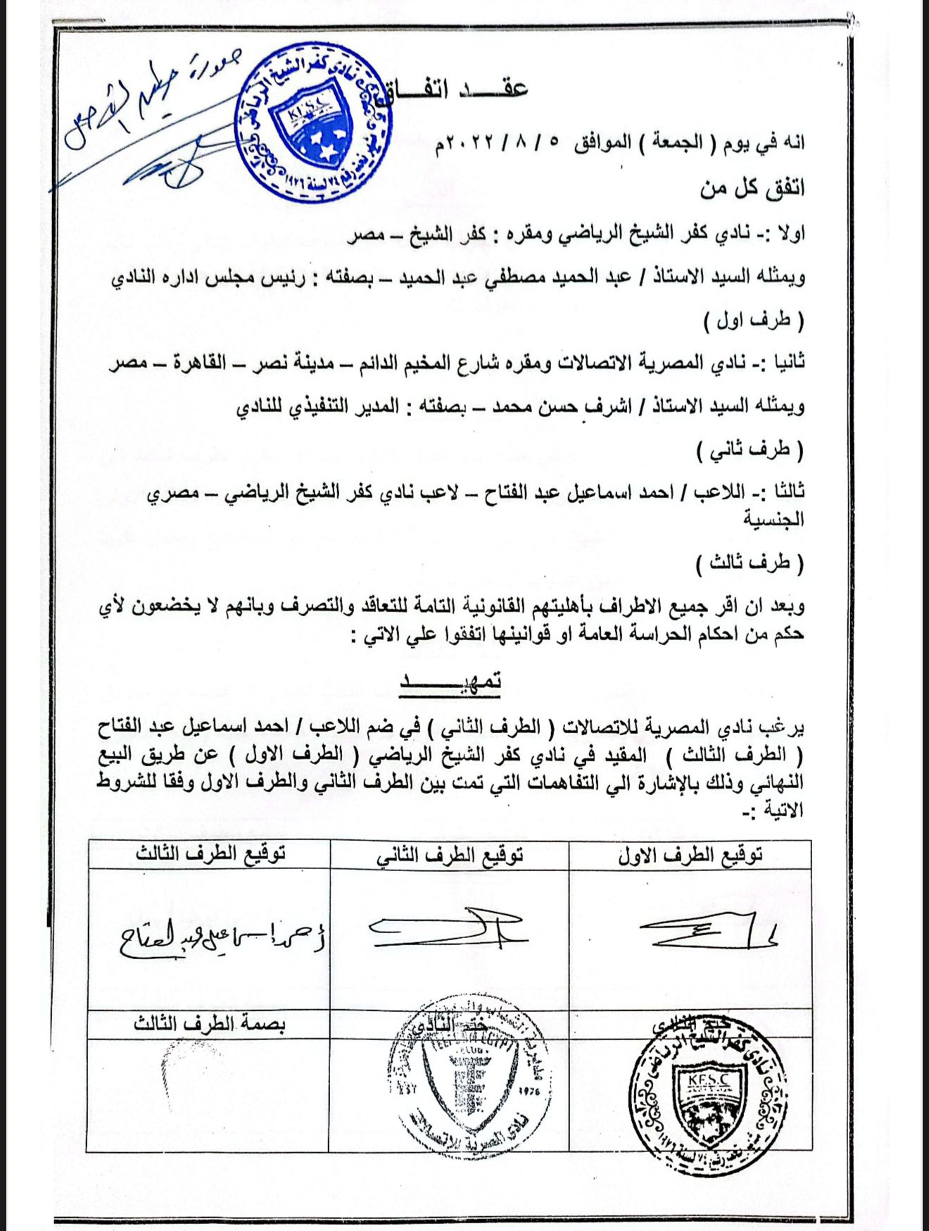 وأعلن مسؤولو مجلس إدارة نادي كفر الشيخ إعداد مذكرة رسمية بالأوراق والمستندات الخاصة بصفقة بيع اللاعب أحمد كفتة إلي نادي المصرية للإتصالات في الموسم الماضي مع وجود بنود تسمح لنادي كفر الشيخ الحصول علي نسبة ال25% حقوق رعاية النادي للاعب قبل بيعه لنادي المصرية للإصالات الذي وافق علي وضع الشرط في العقد حتي تم بيع اللاعب لفريق انبي منذ أيام بعقد ساري لمدة 3 مواسم مقابل 5 مليون جنيه يستحق منهم نادي كفر الشيح مبلع مليون و140 ألف جنيه لم يتم الحصول عليهم حتي الأن رغم المطالب المتكررة وإرسال عدد من الفاكسات لنادي المصري للإتصالات.
