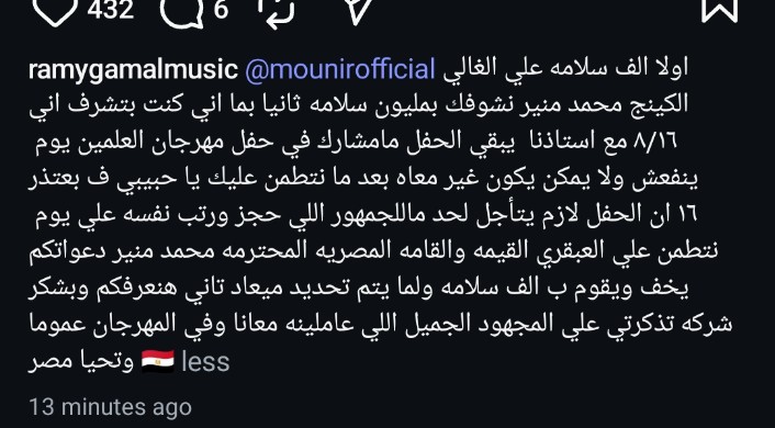 نشر الفنان رامي جمال منشورًا عبر حسابه الرسمي على موقع تبادل الصور والفيديوهات انستجرام أعلن من خلاله تأجيل حفله بمهرجان العلمين الذين كان من المقرر أن يشارك فيه الكينج محمد منير، وذلك بعد تعرض الأخير لوعكة صحية واعتذاره عن حفله بالمهرجان، وقال رامي جمال في منشوره الذي يرصده موقع تحيا مصر: "اولا الف سلامه على الغالي الكينج محمد منير نشوفك بمليون سلامه ثانيا بما اني كنت بتشرف إني ٨/١٦ مع استاذنا يبقي الحفل ما مشارك في حفل مهرجان العلمين يوم ينفعش ولا يمكن يكون غير معاه بعد ما نتطمن عليك يا حبيبي ف بعتذر ١٦ ان الحفل لازم يتأجل لحد ما للجمهور اللي حجز ورتب نفسه علي يوم نتطمن علي العبقري القيمه والقامه المصرية المحترمة محمد منير دعواتكم يخف ويقوم ب الف سلامه ولما يتم تحديد ميعاد تاني هنعرفكم وبشكر شركه تذكرتي علي المجهود الجميل اللي عاملينه معانا وفي المهرجان عموما وتحيا مصر".
