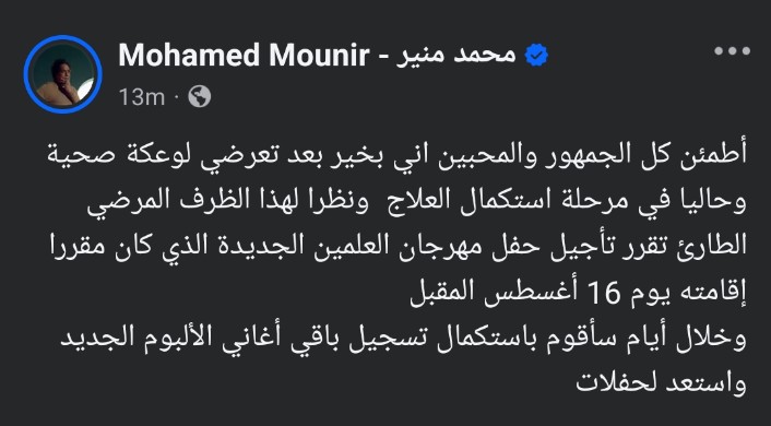 وكانت أعلنت صفحة الفنان محمد مينر تعرضه لوعكة صحية ونقله للمستشفى مما أثار قلق جمهوره عليه،و ونشرت صفحته عبر الفيسبوك: "نظرا لتعرض النجم الكبير الكينج محمد منير لوعكة صحية دخل على أثرها المستشفى تقرر تأجيل حفل مهرجان العلمين الجديدة الذي كان مقررا إقامته يوم 16 أغسطس المقبل ويواصل حاليا استكمال علاجه."