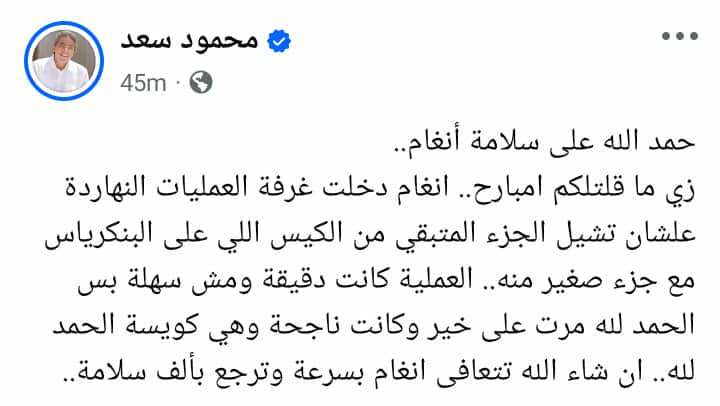 وكتب محمود سعد في منشور رصده موقع تحيا مصر عبر حسابه الرسمي بموقع التواصل الاجتماعي فيسبوك: حمد الله على سلامة أنغام.. زي ما قلتلكم إمبارح.. أنغام دخلت غرفة العمليات النهاردة علشان تشيل الجزء المتبقي من الكيس اللي على البنكرياس مع جزء صغير منه، العملية كانت دقيقة ومش سهلة بس الحمد لله مرت على خير وكانت ناجحة وهي كويسة الحمد لله.. إن شاء الله تتعافى أنغام بسرعة وترجع بألف سلامة.