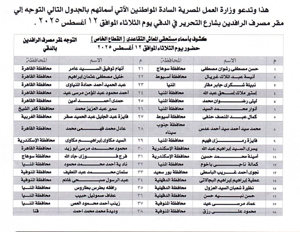 على أن يتوجه السادة المدونة أسماؤهم في جدول "يوم الثلاثاء"، الموافق 12-8-2025 إلى مصرف الرافدين، فرع القاهرة بشارع التحرير ، بالدقي.. والأسماء المدونة في كشف "يوم الأربعاء"، الموافق 13-8-2025، بالتوجه أيضاً إلى مصرف الرافدين بالدقي ، بينما السادة المدونة أسماؤهم في كشف "يوم الخميس"، عليهم التوجه إلى مقر وزارة العمل القديم في 3 شارع يوسف عباس، بمدينة نصر لاستلام البطاقات البنكية الخاصة بهم ..مع ضرورة إحضار بطاقة الرقم القومي ،وتكون سارية ، وكذلك أصل "الهوية التقاعدية".