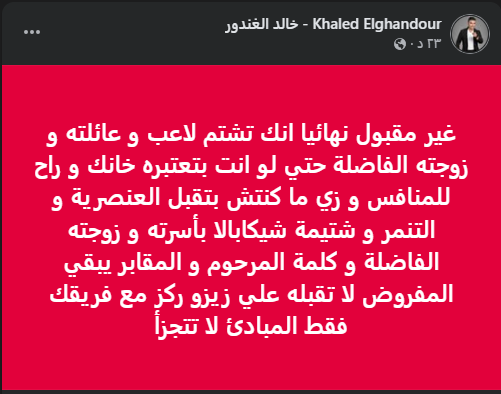 وكتب خالد الغندور في رسالته عبر فيس بوك، غير مقبول نهائيا انك تشتم لاعب وعائلته وزوجته الفاضلة حتي لو انت بتعتبره خانك وراح للمنافس وزي ما كنتش بتقبل العنصرية والتنمر.