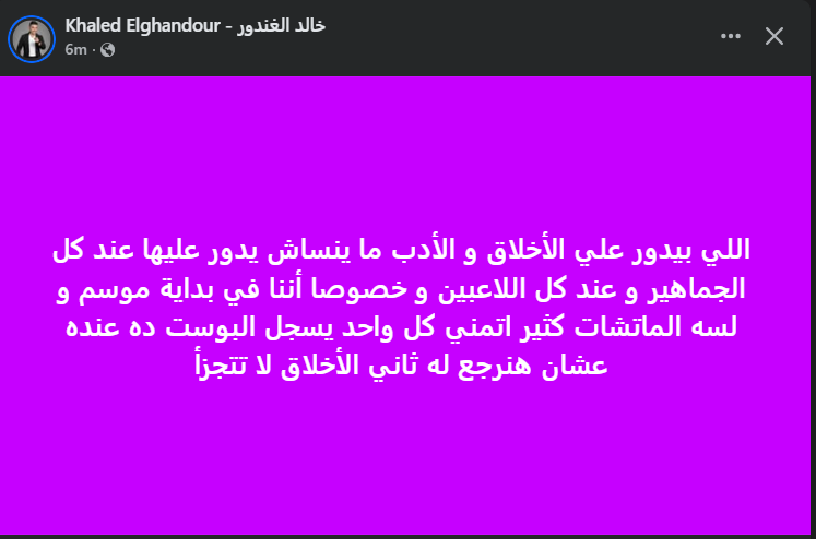 تحيا مصر، وكتب خالد الغندور عبر حسابه الرسمي" فيس بوك": اللي بيدور علي الأخلاق، والأدب ما ينساش يدور عليها عند كل الجماهير، و عند كل اللاعبين وخصوصا أننا في بداية موسم، و لسه الماتشات كثير اتمني كل واحد يسجل البوست ده عنده عشان هنرجع له ثاني الأخلاق لا تتجزأ".