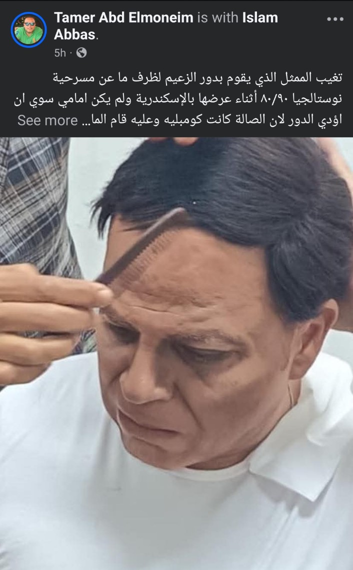 تحدث الفنان تامر عبد المنعم عن تقديمه شخصية الزعيم عادل إمام في مسرحية نوستالجيا ٨٠/٩٠ عند عرضها في الإسكندرية كاشفًا أن السبب هو غياب صاحب الشخصية بشكل مفاجئ عن العرض بعدما كانت الصالة ممتلئة بالجمهور، وقال تامر عبد المنعم في منشوره: "تغيب الممثل الذي يقوم بدور الزعيم لظرف ما عن مسرحية نوستالجيا ٨٠/٩٠ أثناء عرضها بالإسكندرية ولم يكن امامي سوي ان اؤدي الدور لان الصالة كانت كومبليه وعليه قام الماكيير اسلام عباس بعمله والكوافيرة سلوي احمد وانا الآخر قمت بعملي وكانت هذه هي النتيجة شكرا اسلام انت ماكبر كبير المسرح لا يعيقه شئ واحترام الجمهور واجب."