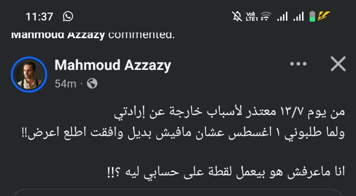 من جانبه حرص الفنان محمود العزازي على الرد وأن يبرئ نفسه من اعتذاره المفاجئ عن المسرحية وتسببه في أزمة، قائلًا في منشور يرصده موقع تحيا مصر: "جماعة الهيصة دي كلها مصطنعة وعهد الله ما حصل أنا اعتذرت بالاتفاق بسبب ظرف قهري عندي ومساعدينه على علم به، ما يا هم خبوا عليه يا هو بيصطنع موقف المنقذ واللقطة عجباه وانتوا عارفين ايهما أقرب للحقيقة اكتر مني، أنا مصدوم لان ماكنش في أي خلافات بيني وبينه اصلا عشان يقرر يصطنع موقف بالشكل ده !!وحياة النبي والله العظيم معتذر من يوم ١٣ يوليو ولما طلبوني (جدعنة) يوم ١ أغسطس طلعت عرضت وسلمنا على بعض وحضنا بعض أن ده اخر يوم ليا".