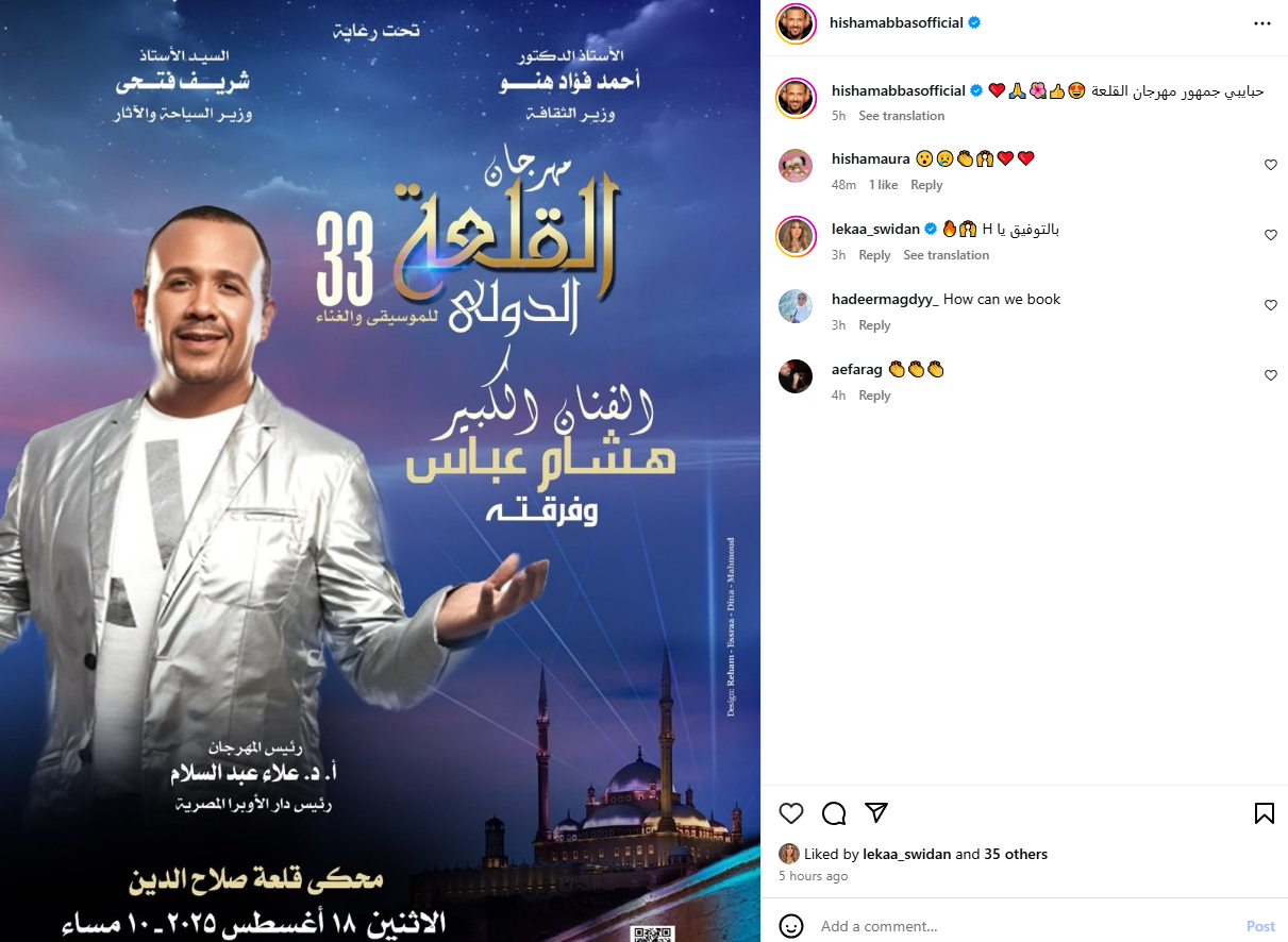 ونشر هشام عباس، بوستر الحفل وفقا لما رصده موقع تحيا مصر، عبر صفحته الرسمية على موقع التواصل الاجتماعي «إنستجرام»، وعلق عليه: "حبايبي جمهور مهرجان القلعة".