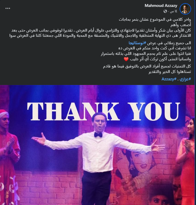 وكتب محمود عزازي، وفقا لما رصده موقع تحيا مصر منشورا، عبر صفحته الرسمية على موقع التواصل الاجتماعي فيسبوك قائلا: "وآخر كلامي في الموضوع عشان بنمر بحاجات أصعب وأهم.. كان الأولى بيان شكر وأمتنان تقديرًا لاجتهادي والتزامي طوال أيام العرض، تقديرًا لوقوفي بجانب العرض حتى بعد الاعتذار هي دي النهاية المنطقية والأجمل والأشيك والمتسقة مع المحبة والمودة اللي جمعتنا كلنا في العرض سوا".