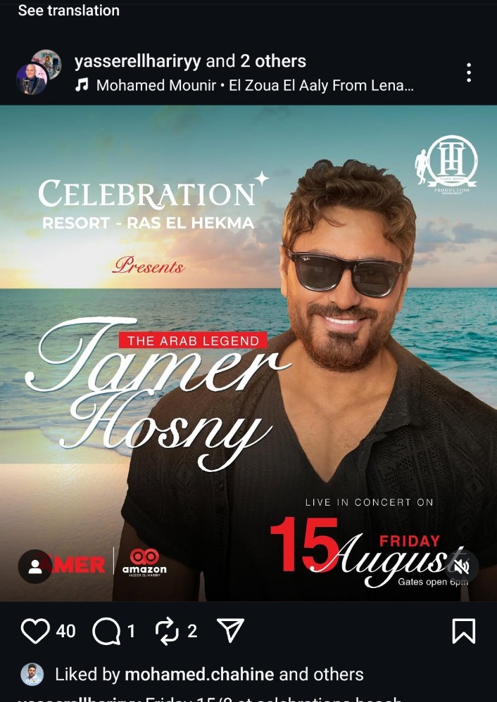 وكان تامر حسني قد أحيا مؤخراً حفلاً كبيراً في العاصمة اللبنانية بيروت حظي بتفاعل واسع على مواقع التواصل الاجتماعي، حيث امتلأ المسرح بمحبيه من مختلف المناطق اللبنانية، وأعرب تامر خلال الحفل عن سعادته الكبيرة بالاستقبال الحافل الذي حظي به من الجمهور اللبناني، مؤكداً على محبته الخاصة للشعب اللبناني وتقديره لدعمه المستمر له منذ بداياته الفنية، وقدّم تامر خلال الحفل مجموعة من أنجح أغانيه التي أشعلت الأجواء، وسط تفاعل وحماس كبيرين من الجمهور.