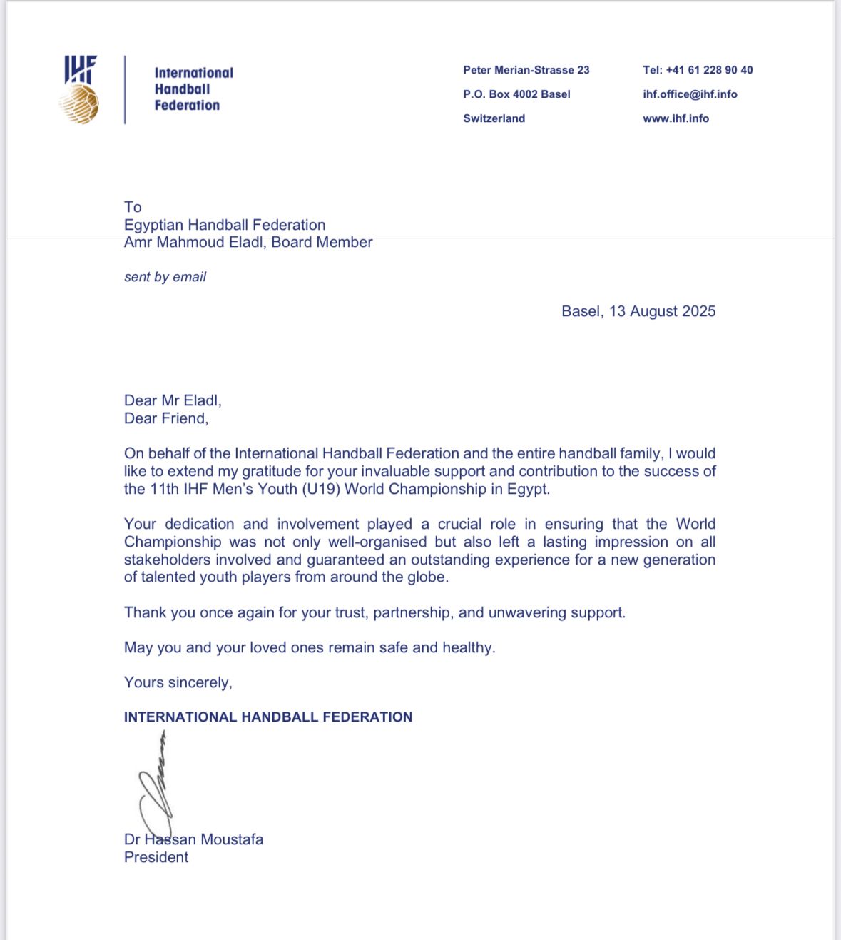 الاتحاد الدولي لكرة اليد يوجه خطاب شكر إلى عمرو العدل تقديرًا لجهوده في بطولة العالم للناشئين