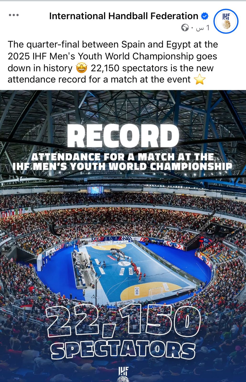 الاتحاد الدولي لكرة اليد يشيد بالحضور التاريخي في مباراة مصر وإسبانيا بمونديال الناشئين