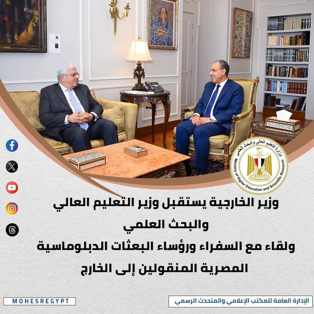 واستقبل د. بدر عبد العاطي وزير الخارجية والهجرة وشئون المصريين، د. محمد أيمن عاشور، وزير التعليم العالي والبحث العلمي، وخلال الاجتماع التقى السيد وزير التعليم العالى والبحث العلمى برؤساء البعثات المصرية المنقولين إلى الخارج، حيث استعرض جهود وزارة التعليم العالى في توطيد أواصر التعاون مع الجامعات التعليمية في الخارج والدور المحورى الذى تضطلع به المكاتب الثقافية في الخارج، مؤكدًا الحرص على مواصلة التنسيق مع السفارات المصرية بالخارج لتعزيز أوجه التعاون مع مختلف الدول بما يحقق المصالح الوطنية.