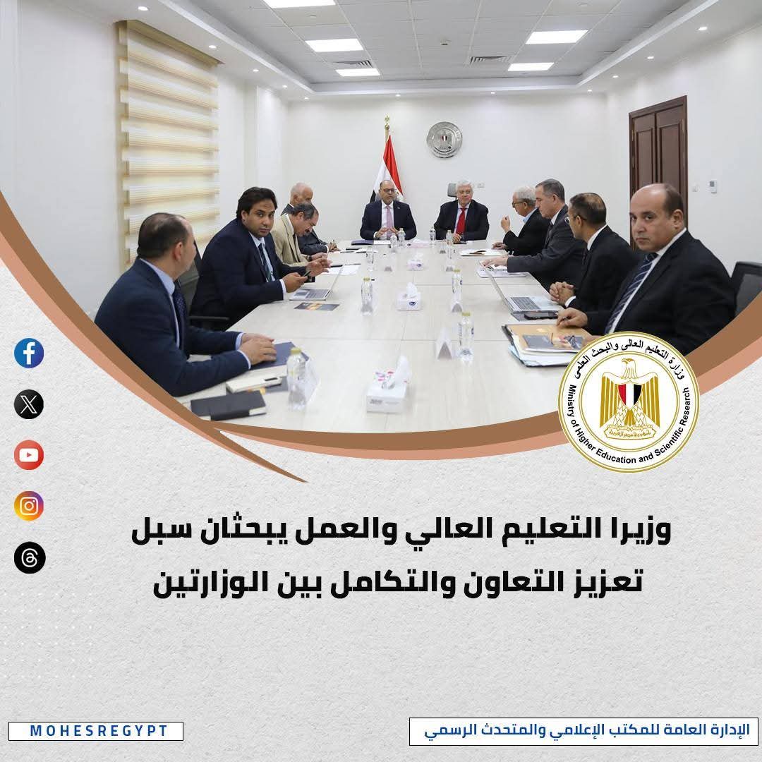 كما عقد الدكتور أيمن عاشور وزير التعليم العالي والبحث العلمي، ومحمد جبران وزير العمل، اجتماعًا لبحث سبل تعزيز التعاون بين الوزارتين، وأشار الوزير إلى حجم التوسع الكبير الذي شهدته منظومة التعليم العالي المصرية خلال السنوات الأخيرة، من خلال إنشاء جامعات جديدة أو فتح أفرع لجامعات أجنبية، أو منح درجات علمية مزدوجة بالتعاون مع الجامعات الدولية المرموقة، لافتًا إلى تنوع روافد منظومة التعليم العالى المصرية ما بين جامعات حكومية وخاصة وأهلية وتكنولوجية، وأفرع للجامعات الأجنبية، وتنوع المسارات التعليمية التي تلبي احتياجات سوق العمل المتغير على مستوى العالم، مؤكدًا حرص الوزارة على تعزيز التعاون الأكاديمي والبحثي بين المؤسسات التعليمية والبحثية، ودعم سبل التواصل بين الجانبين بما يفتح آفاقًا أوسع للشراكة العلمية والأكاديمية التي تخدم أولويات البلدين وتُسهم في بناء القدرات البشرية، وخلال الاجتماع، بحث الجانبان سبل تعزيز التعاون والتكامل المشترك بين الوزارتين، بما يعود بالنفع على تعزيز قدرات الطلاب والخريجين وتأهيلهم لتلبية متطلبات سوق العمل.