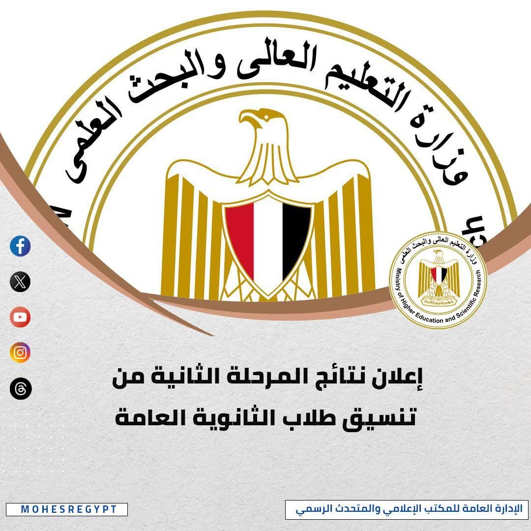 أنهى مكتب تنسيق القبول بالجامعات أعمال المرحلة الثانية من تنسيق طلاب الثانوية العامة، والتي أُتيحت خلالها إمكانية تسجيل الرغبات إلكترونيًا من خلال موقع التنسيق الرسمي، وذلك خلال الفترة من الأربعاء الموافق 6 أغسطس 2025 وحتى الأحد الموافق 10 أغسطس 2025، ولمدة خمسة أيام، وقد انتهت أعمال هذه المرحلة بعد مراجعة دقيقة للرغبات التي سجّلها الطلاب، وترشيحهم للكليات والمعاهد وفقًا للقواعد المنظمة المعتمدة من المجلس الأعلى للجامعات، وفي حدود الأعداد المقررة لكل كلية ومعهد.