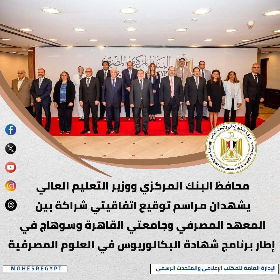شهد حسن عبدالله محافظ البنك المركزي المصري، والدكتور أيمن عاشور وزير التعليم العالي والبحث العلمي، مراسم توقيع اتفاقيتي شراكة بين المعهد المصرفي المصري وكل من جامعة القاهرة وجامعة سوهاج، للمشاركة في البرنامج التعليمي الجديد بدءًا من العام الدراسي 2025/2026، وخلال الاجتماع جدد الدكتور/ أيمن عاشور وزير التعليم العالي والبحث العلمي، شكره وتقديره ل حسن عبدالله محافظ البنك المركزي المصري، على دعمه المستمر وتعاونه المثمر في إطلاق هذا البرنامج الوطني الهام مؤكدًا أن التعاون بين وزارة التعليم العالي والبنك المركزي، يعكس التزام الدولة بتطوير التعليم المصرفي وتعزيز بناء الكفاءات الوطنية التي تساهم في دفع عجلة التنمية الاقتصادية والاجتماعية في مصر.
