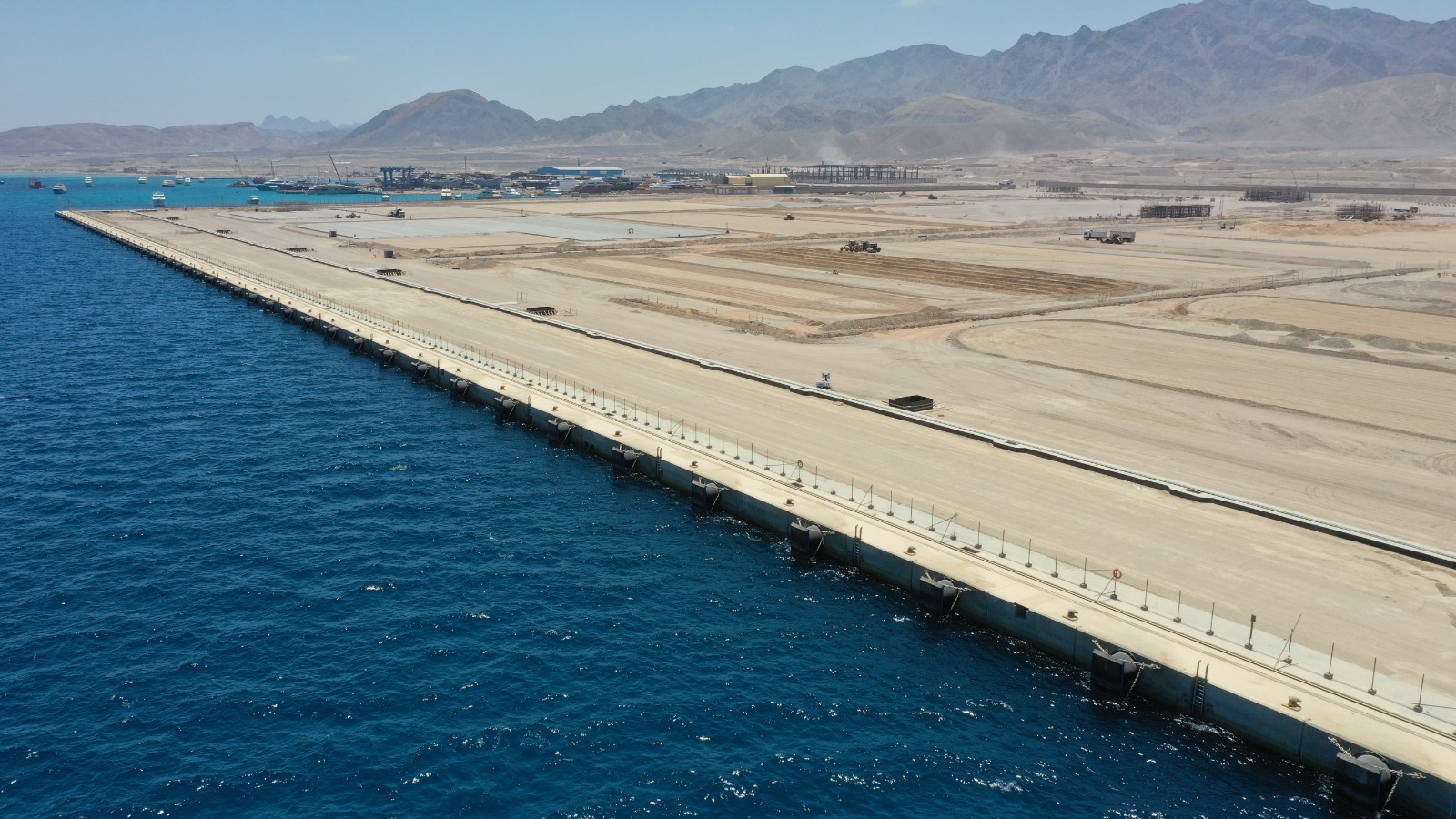 2. يتم تنفيذ المشروع على مساحة 776 ألف م٢ تقريباً، مع رصيف بطول 1100 متر، وعمق 17 متراً، وتم الانتهاء من من أعمال البنية التحتية بنسبة 100%، التي نفذتها شركات وطنية مصرية متخصصة