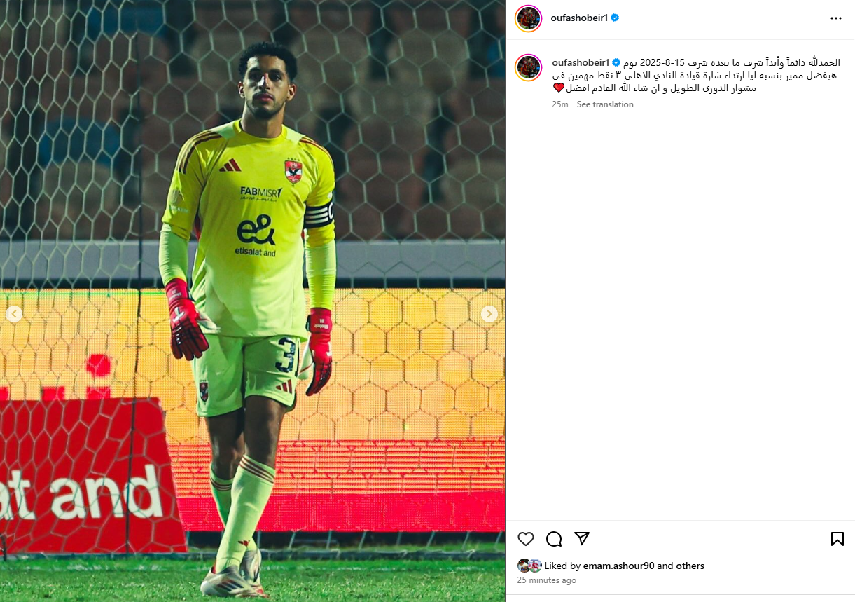 تحيا مصر، وكتب مصطفي شوبير عبر حسابه الرسمي"انستجرام":" الحمدلله دائماً وأبداً شرف ما بعده شرف 15-8-2025 يوم هيفضل مميز بنسبه ليا، ارتداء شارة قيادة النادي الاهلي ٣ نقط مهمين في مشوار الدوري الطويل وإن شاء الله القادم أفضل".