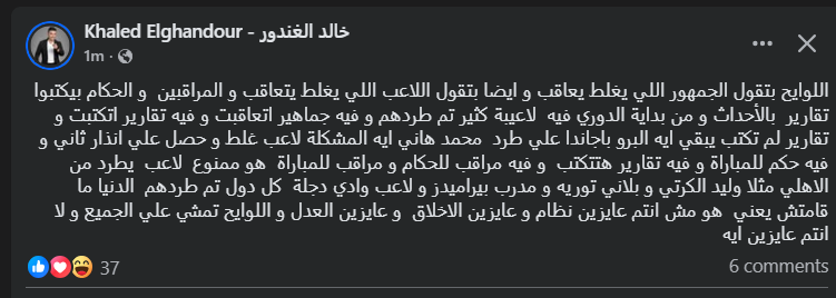 تحيا مصر، وكتب خالد الغندور عبر حسابه الرسمي"فيس بوك": اللوائح بتقول الجمهوراللي يغلط يعاقب، وايضاً بتقول اللاعب اللي يغلط يتعاقب، و المراقبين والحكام بيكتبوا تقارير بالأحداث، و من بداية الدوري فيه لاعيبة كثير تم طردهم، و فيه جماهير اتعاقبت، و فيه تقارير اتكتبت".