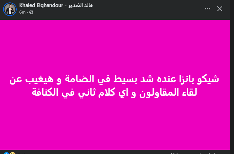 تحيا مصر، وكتب خالد الغندور عبر حسابه الرسمي"فيس بوك":" شيكو بانزا عنده شد بسيط في الضامة، وهيغيب عن لقاء المقاولون و اي كلام ثاني في الكنافة".