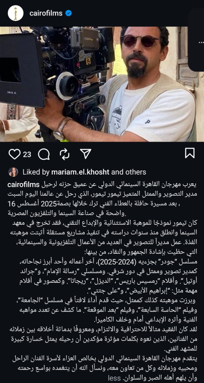 واستكمل: "لقد كان الفقيد مثالاً للاحترافية والالتزام، ومعروفًا بدماثة أخلاقه بين زملائه من الفنانين الذين نعوه بكلمات مؤثرة مؤكدين أن رحيله يمثل خسارة كبيرة للمشهد الفني، يتقدم مهرجان القاهرة السينمائي الدولي بخالص العزاء لأسرة الفنان الراحل ومحبيه وزملائه وكل من تعاون معه، ونسأل الله أن يتغمده بواسع رحمته وأن يلهم أهله الصبر والسلوان".