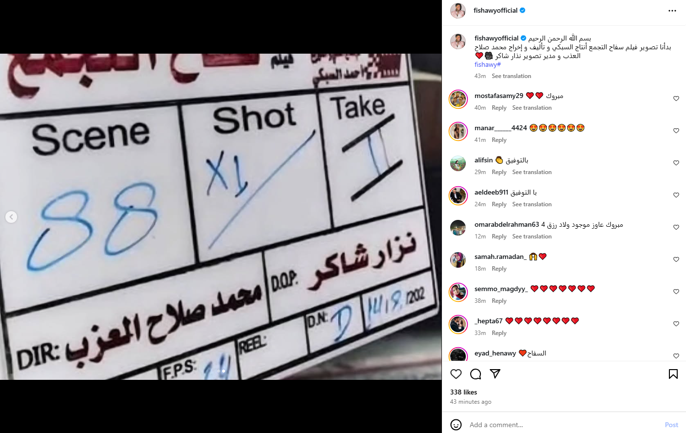 وشارك الفنان أحمد الفيشاوي، وفقا لما رصده موقع تحيا مصر، صورة لـ كلاكيت العمل، عبر صفحته الرسمية على موقع التواصل الاجتماعي إنستجرام، وعلق عليها: بسم الله الرحمن الرحيم، بدأنا تصوير فيلم سفاح التجمع، إنتاج السبكي، وتأليف وإخراج محمد صلاح العزب، ومدير التصوير نذار شاكر".
