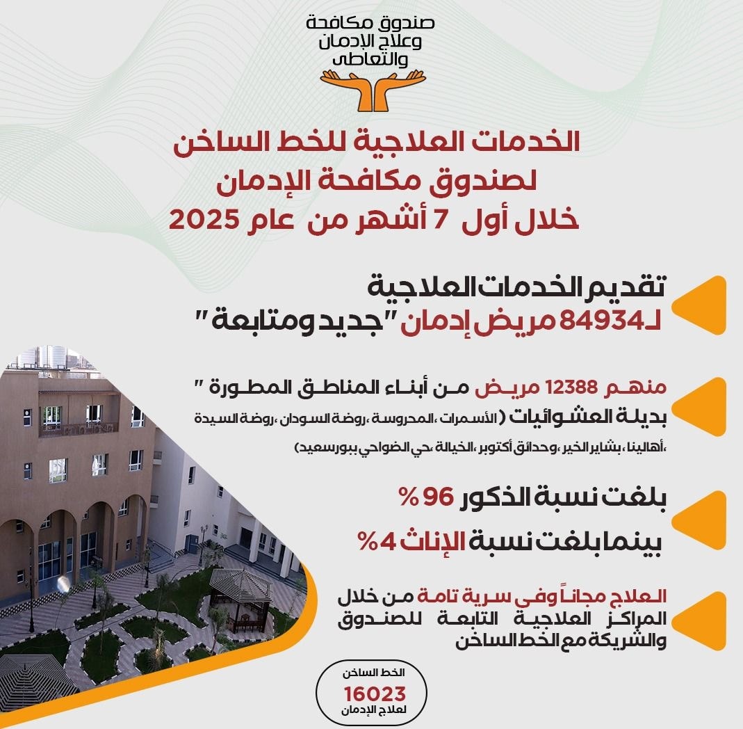 صندوق مكافحة الإدمان: تقديم العلاج المجاني لـ 84 ألف مريض خلال 7 أشهر من 2025 بينهم 12 ألفًا من سكان المناطق المطورة