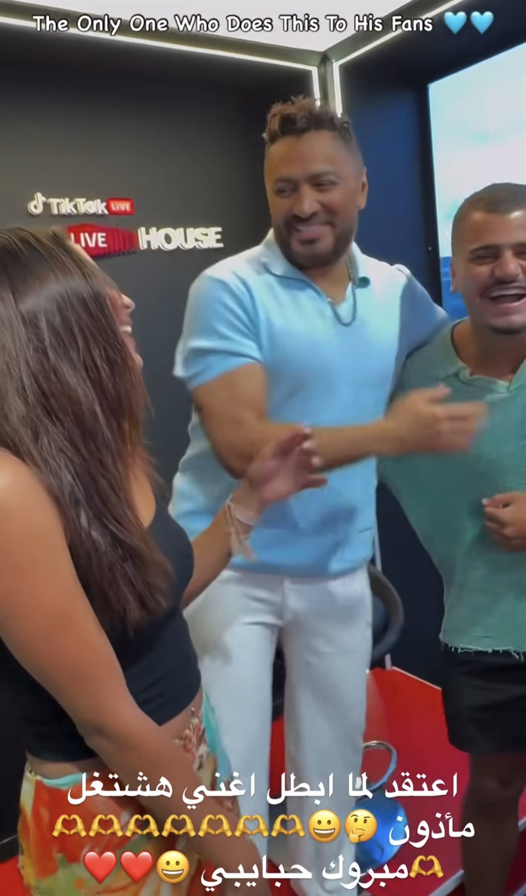 وعلى صعيد آخر، كان قد خرج الفنان تامر حسني بفيديو لايف على حسابه الرسمي بتطبيق تيك توك، للحديث والتفاعل مع الجمهور والرد على أسئلتهم المختلفة، والكشف عن جوانب كثيرة من جوانب حياته الشخصية.