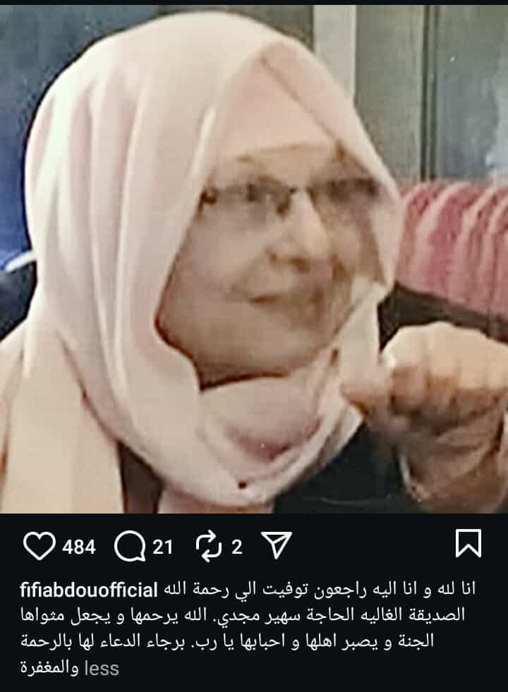 كتبت فيفي عبده في منشور رصده موقع تحيا مصر عبر حسابها الرسمي بموقع تبادل الصور والفيديوهات انستجرام: انا لله و انا اليه راجعون توفيت الي رحمة الله الصديقة الغاليه الحاجة سهير مجدي. الله يرحمها ويجعل مثواها الجنة ويصبر اهلها واحبابها يا رب. برجاء الدعاء لها بالرحمة والمغفرة.