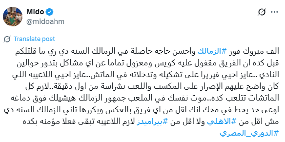 تحيا مصر، وكتب ميدو عبر حسابه الرسمي"إكس":" الف مبروك فوز الزمالك وأحسن حاجة حاصلة في الزمالك السنه دي زي ما قلتلكم قبل كده ان الفريق مقفول عليه كويس ومعزول تماما عن اي مشاكل بتدور حوالين النادي".