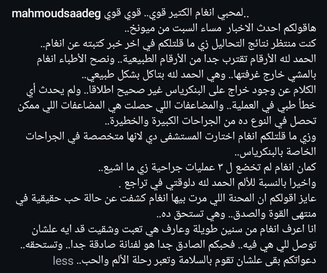 وتابع محمود سعد حديثه نافيًا الأخبار المتداولة عن خضوع أنغام لـ 3 عمليات جراحية وإصابتها بخراج إثر خطأ طبي تعرضت له، وقال في منشوره الذي رصده موقع تحيا مصر: "الكلام عن وجود خراج على البنكرياس غير صحيح اطلاقا.. ولم يحدث أي خطأ طبي في العملية.. والمضاعفات اللي حصلت هي المضاعفات اللي ممكن تحصل في النوع ده من الجراحات الكبيرة والخطيرة، وزي ما قلتلكم أنغام اختارت المستشفى دي لانها متخصصة في الجراحات الخاصة بالبنكرياس.. كمان انغام لم تخضع ل 3 عمليات جراحية زي ما اشيع... واخيرا بالنسبة للألم الحمد لله دلوقتي في تراجع.