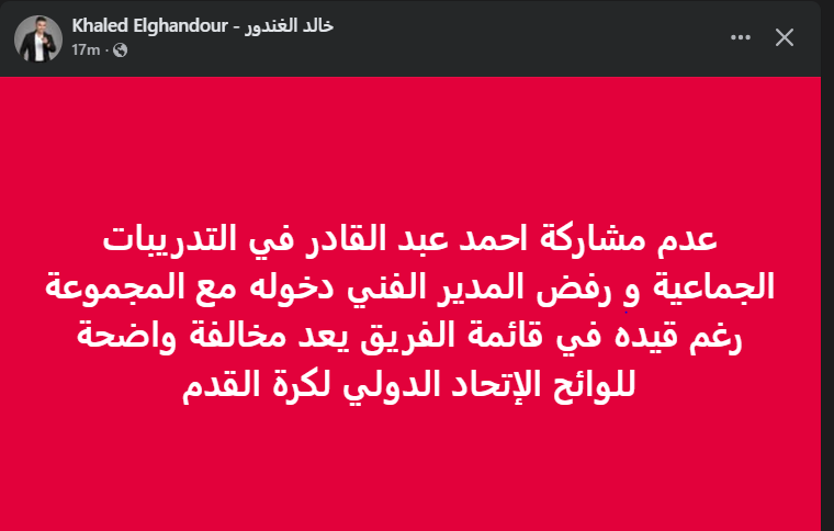 تحيا مصر، وكتب خالد الغندور عبر حسابه الرسمي"فيس بوك": عدم مشاركة أحمد عبد القادر في التدريبات الجماعية، ورفض المدير الفني دخوله مع المجموعة رغم قيده في قائمة الفريق يعد مخالفة واضحة للوائح الإتحاد الدولي لكرة القدم".