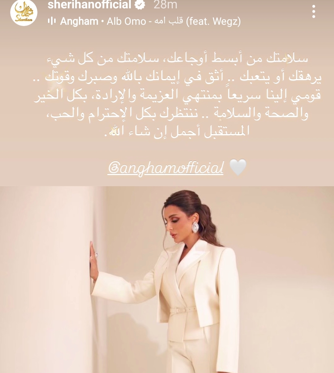 عبر حسابها على انستجرام، نشرت الفنانة الكبيرة شريهان صورة لأنغام مرفقة بكلمات مليئة بالمحبة والتقدير، عبّرت خلالها عن تمنياتها لها بالشفاء العاجل، وثقتها في قدرتها على تجاوز هذه المحنة، وجاء في الرسالة التي رصدها موقع تحيا مصر: "سلامتك من أبسط أوجاعك، وسلامتك من كل شيء يرهقك أو يتعبك، أثق في إيمانك بالله وصبرك وقوتك، قومي إلينا سريعاً بمنتهى العزيمة والإرادة، بكل الخير والصحة والسلامة، ننتظرك بكل الاحترام والحب.. المستقبل أجمل إن شاء الله." كلمات شريهان لاقت تفاعلاً كبيراً من جمهور النجمتين، الذين أثنوا على هذا الدعم النبيل، خاصة في ظل ما تمر به أنغام من ظرف صحي دقيق.