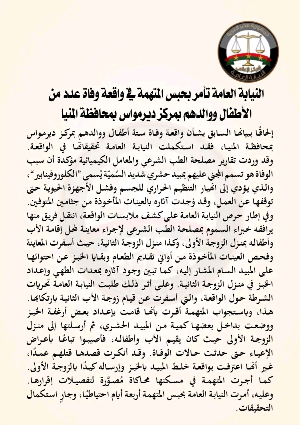 كشفت النيابة العامة تفاصيل جديدة في واقعة وفاة ستة أطفال ووالدهم بمركز ديرمواس في محافظة المنيا، حيث أمرت بحبس المتهمة أربعة أيام على ذمة التحقيقات بعد اعترافها بارتكاب الجريمة.