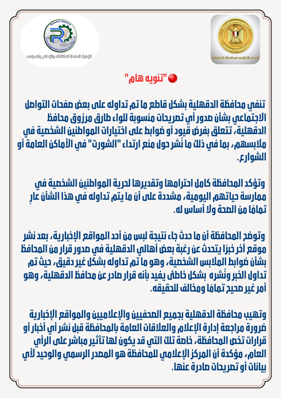 أصدر المركز الإعلامي لمحافظة الدقهلية، اليوم الثلاثاء، بيانًا رسميًا نفى فيه بشكل قاطع ما تم تداوله عبر بعض صفحات مواقع التواصل الاجتماعي بشأن صدور تصريحات منسوبة للواء طارق مرزوق، محافظ الدقهلية، حول فرض قيود أو ضوابط على اختيارات المواطنين الشخصية في ملابسهم، ومن بينها ما نُشر عن منع ارتداء “الشورت” في الأماكن العامة والشوارع.