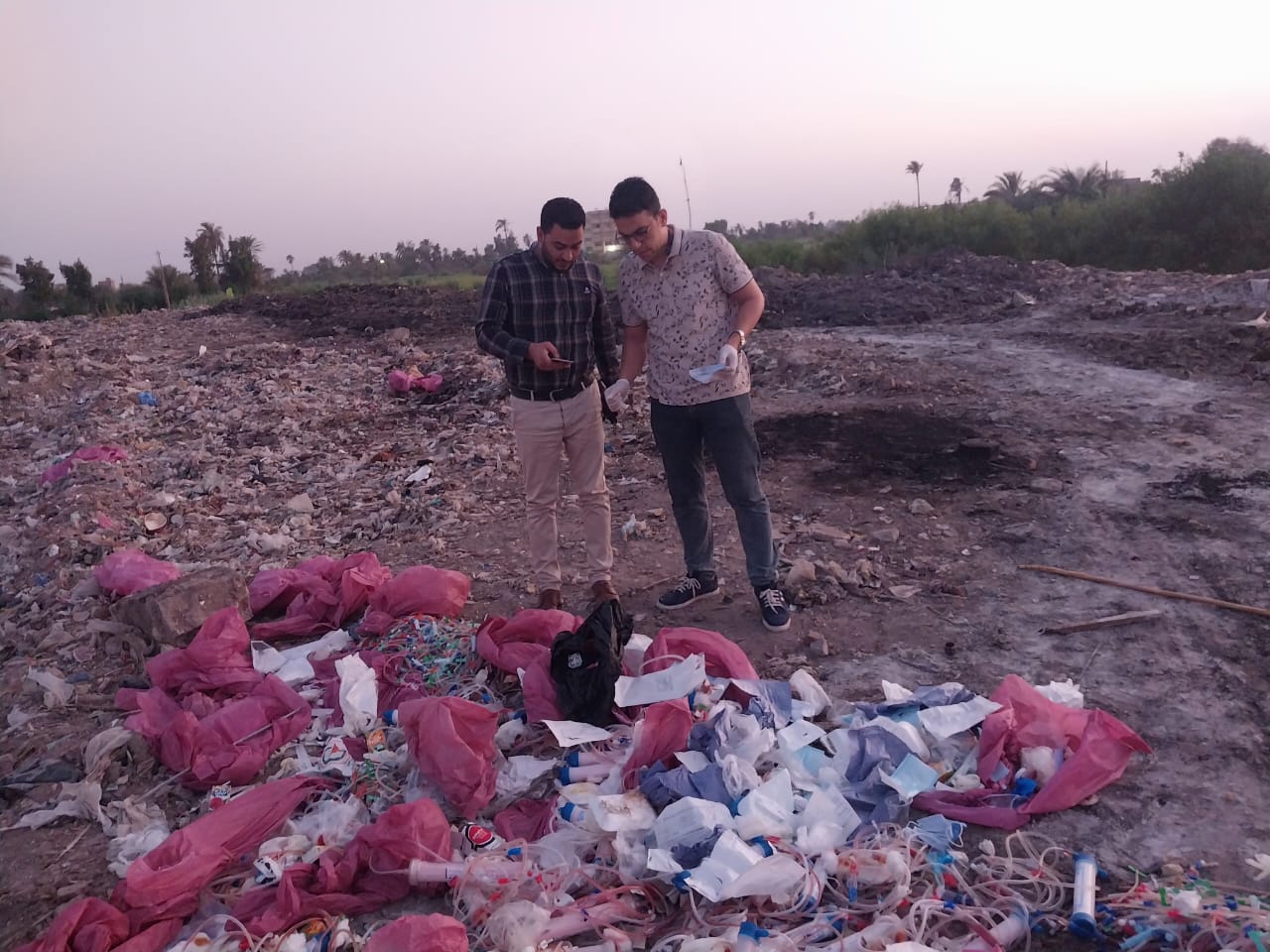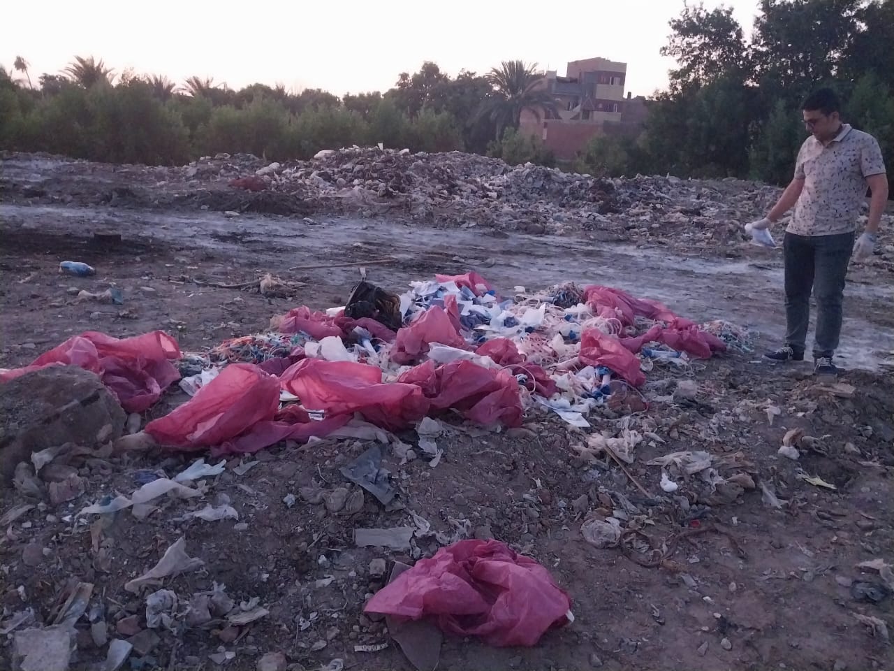 و اتضح من الفحص انها نفايات من غسيل الكلي وبها انابيب تحاليل معملية ووصلات و فلاتر غسيل و تم التاكد من انها من احد مراكز الغسيل الكلوى الخاصة.