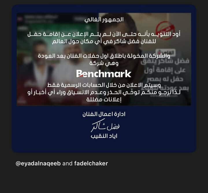 ومع زيادة البحث، قررت شركة بنش مارك الخروج للكشف عن حقيقة حفل فضل شاكر في مصر، حيث أصدر بيان شديد اللهجة على حسابهم الرسمي بمواقع التواصل الاجتماعي المختلفة، جاء فيه: الجمهور الغالي.. أود التنويه بأنه حتى الآن لم يتم الإعلان عن إقامة حفل للفنان فضل شاكر في أي مكان حول العالم القاهرة.