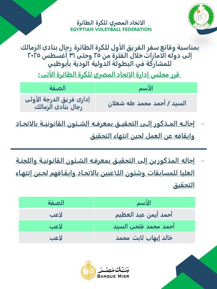 أعلن الاتحاد المصري للكرة الطائرة عبر صفحاته الرسمية على مواقع التواصل الاجتماعي عن صدور قرار بإحالة أحمد محمد طه شعلان إداري فريق الدرجة الأولى رجال بنادي الزمالك إلى التحقيق بمعرفة الشؤون القانونية بالاتحاد، مع إيقافه عن العمل لحين انتهاء التحقيقات، ويستعرض تحيا مصر التفاصيل.