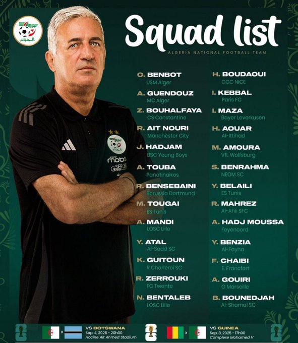 أعلن فلاديمير بيتكوفيتش المدير الفني لمنتخب الجزائر عن قائمة منتخب بلاده لمواجهتي بوتسوانا وغيننيا في تصفيات أفريقيا المؤهلة لكأس العالم، ويتواجد رياض محرز لاعب أهلي جدة السعودي على رأس القائمة بجانب ريان آيت نوري لاعب فريق مانشستر سيتي الإنجليزي، ويستعرض موقع تحيا مصر التفاصيل.