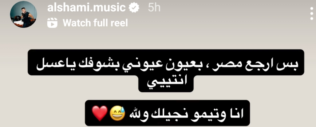 وجّه المطرب الشامي رسالة مباشرة للطفلة الصغيرة هايدي صاحبة لقب فتاة الشيبسي عبّر فيها عن امتنانه وحبه لها، قائلًا عبر خاصية الستوري التي رصدها موقع تحيا مصر: "بس أرجع مصر، بعيون عيوني أشوفك يا عسل إنتي.. أنا وتيمو نجيلك والله"، في لفتة إنسانية لاقت تفاعلًا كبيرًا من الجمهور على مواقع التواصل، مشيدين بتواضعه واهتمامه بمشاعر الأطفال وجمهوره الصغير.