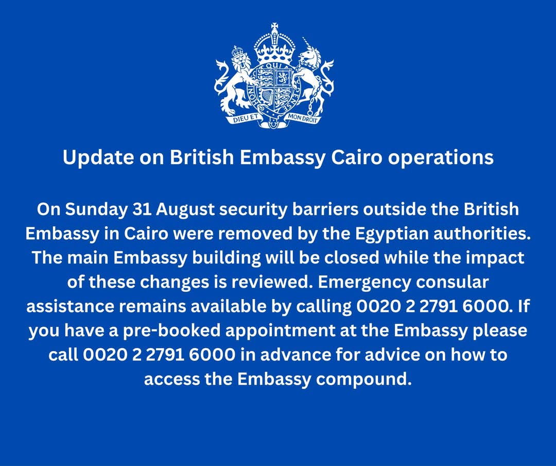 وذكرت السفارة البريطانية في بيان لها عبر صفحتها الرسمية الفيسبوك، أن خدمات المساعدة القنصلية الطارئة ستظل متاحة من خلال الاتصال على الرقم 0020 2 2791 6000.