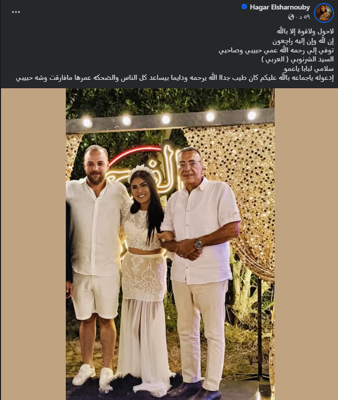 وكانت الفنانة هاجر الشرنوبي، قد أعلنت عن وفاة عمها السيد الشرنوبي، وفقا لما رصده موقع تحيا مصر، عبر صفحتها الرسمية على موقع التواصل الاجتماعي فيسبوك قائلة: لا حول ولا قوة الإ بالله، إن لله وإن إليه لراجعون، توفي إلى رحمة الله عمي حبيبي وصاحبي السيد الشرنوبي (العربي)، سلامي لبابا يا عمو، إدعوله ياجماعة بالله عليكم كان طيب جدا، الله يرحمه ودايما كان بيساعد كل الناس والضحكة عمرها مافارقت وشه حبيبي.