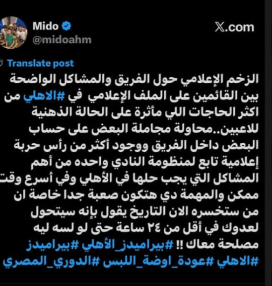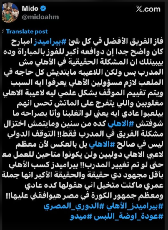 وكتب ميدو عبر حسابه الرسمي"اكس": الزخم الإعلامي حول الفريق والمشاكل الواضحة بين القائمين على الملف الإعلامي في الاهلي من اكثر الحاجات اللي مأثرة على الحالة الذهنية للاعبين".