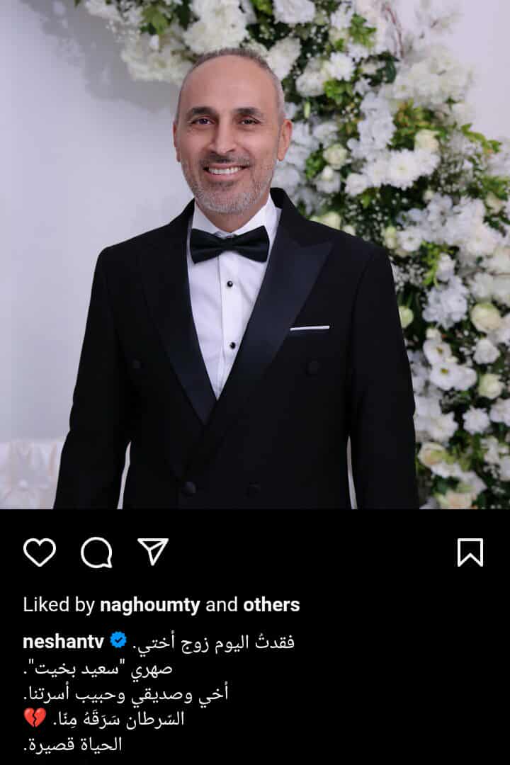 وقال نيشان في منشور رصده موقع تحيا مصر عبر حسابها الرسمي بموقع تبادل الصور والفيديوهات انستجرام، مرفقا صورة زوج شقيقته وعلق عليها: فقدتُ اليوم زوج أختي، صهري "سعيد بخيت"، أخي وصديقي وحبيب أسرتنا، السّرطان سَرَقَهُ مِنّا.. الحياة قصيرة، البقاء لله.