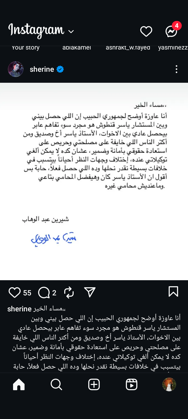 كانت شيرين عبد الوهاب في 22 اغسطس وعندما خرج ياسر قنطوش لإعلان عودتها إلى حسام حبيب، قد خرجت وأعلنت سحب جميع توكيلاتها من المستشار ياسر قنطوش، موضحة: يا استاذ ياسر انت مش المحامي بتاعي وهنزل بيان بده، ولو اتكلمت عني اي كلمة حلوة او وحشه، او هزار او نكته هتتحسب عليك، تعمل متعملش بقي مؤتمر صحفي وتطلع تتكلم عن شيرين عبد الوهاب اي كلمة هتتحسب عليك.